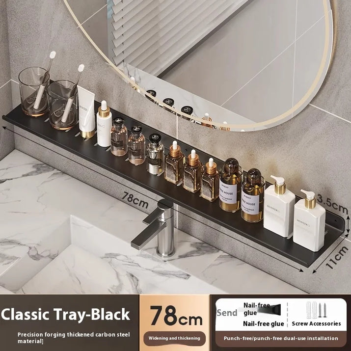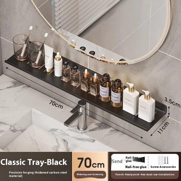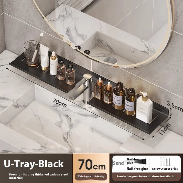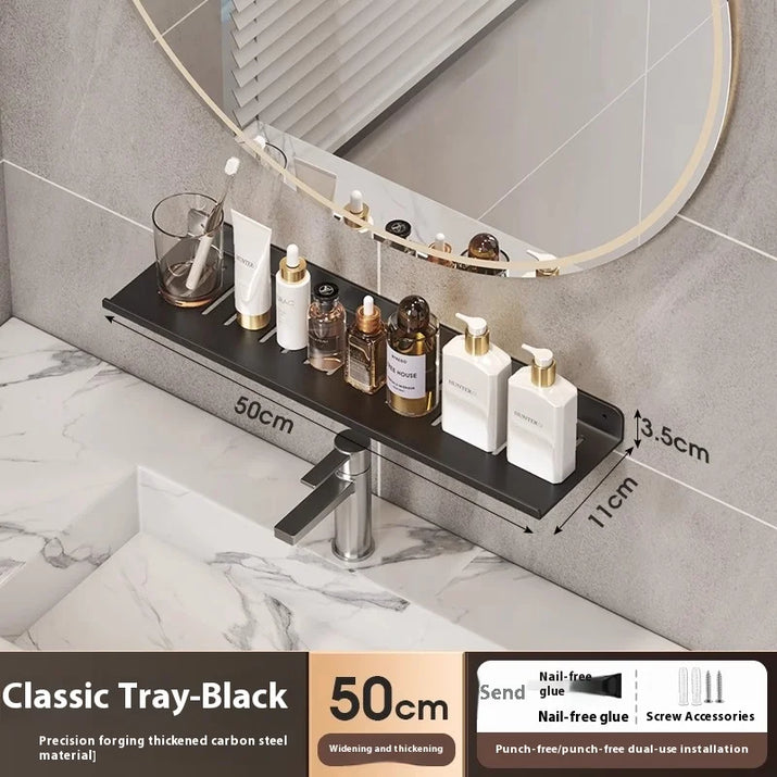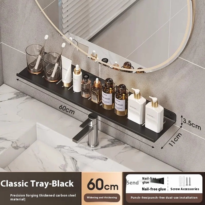 Elevate your bathroom organization with this sleek wall-mounted shelf, designed to provide convenient storage while enhancing your space's aesthetic appeal.